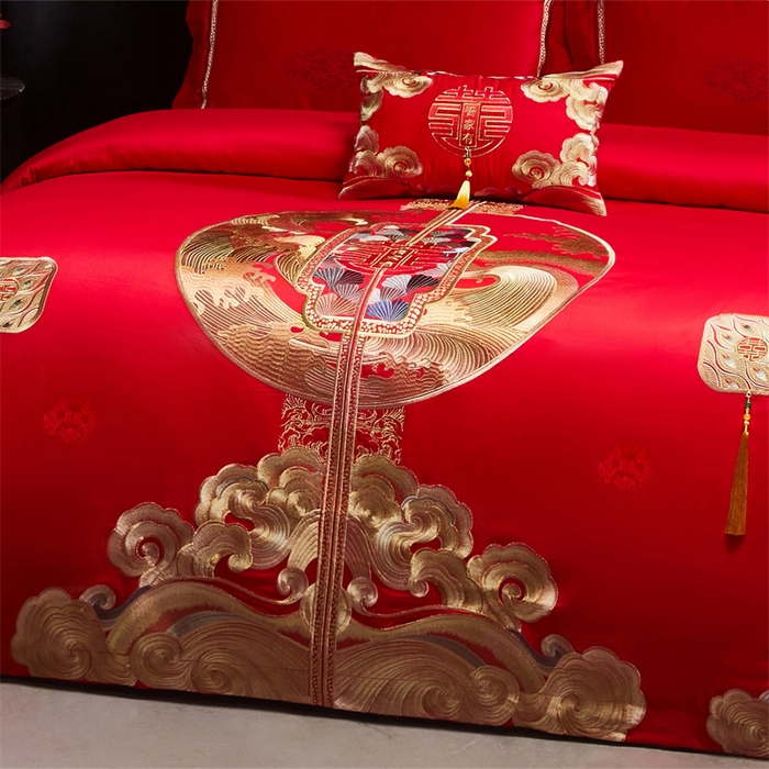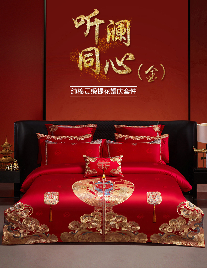 红番天婚庆 (控价)2025新款全棉提花全棉贡缎提花新中式婚庆四件套多件套 听澜同心-金
