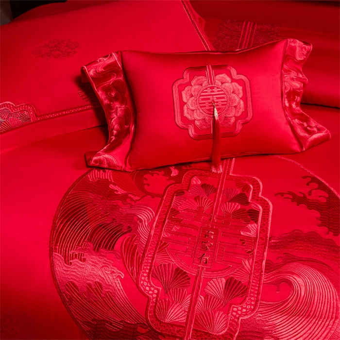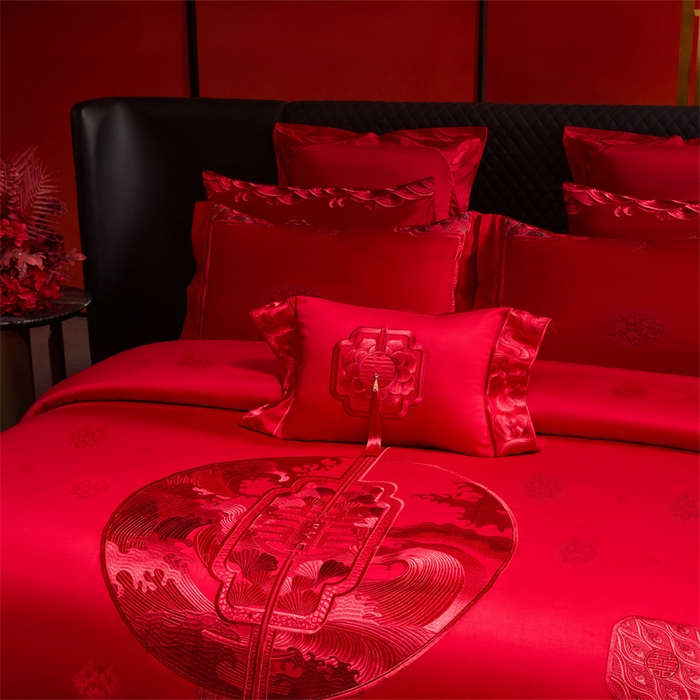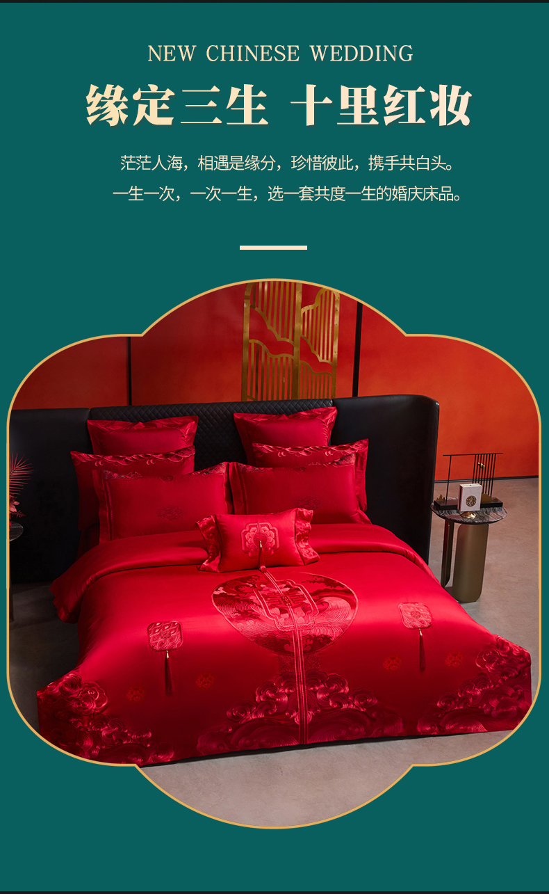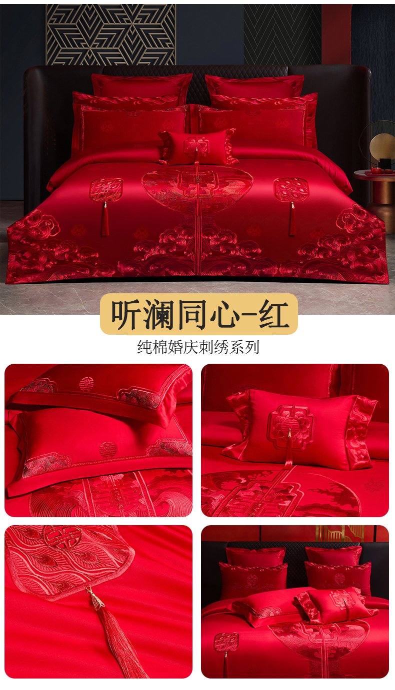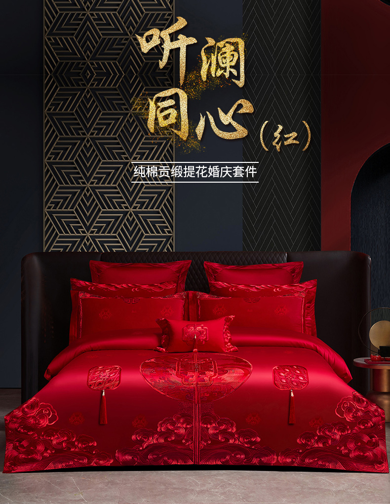 红番天婚庆 (控价)2025新款全棉提花全棉贡缎提花新中式婚庆四件套多件套 听澜同心-红